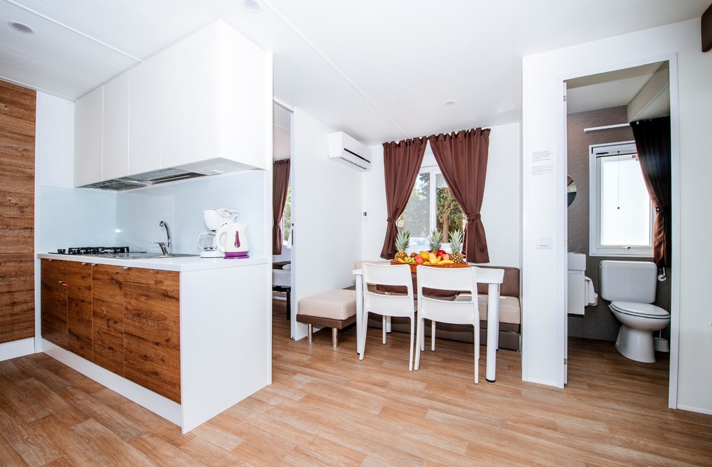 Deluxe Family Mobile Home: für bis zu 5 Personen, ca. 34 m2 + überdachte Terrasse 28 m2, Schlafzimmer mit Doppelbett, 2 Schlafzimmer jedes mit 1 Einzelbett, Wohnzimmer mit Essecke (Schlafplatz für eine Person), Kochecke, 2 × Dusche/WC.