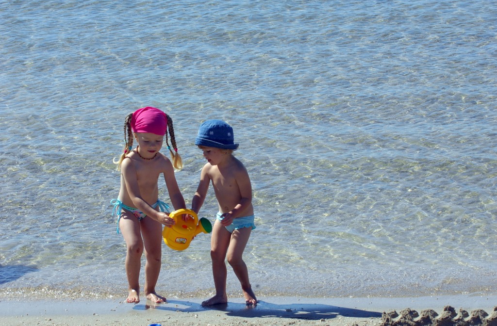 Ca. 1.5 km langer, flachabfallender Sandstrand in 100-300 m Entfernung. Betonierter Bereich, Kiesstrand. Liegestühle- und Sonnenschirme kostenpflichtig. Zahlreiche Wassersportmöglichkeiten.