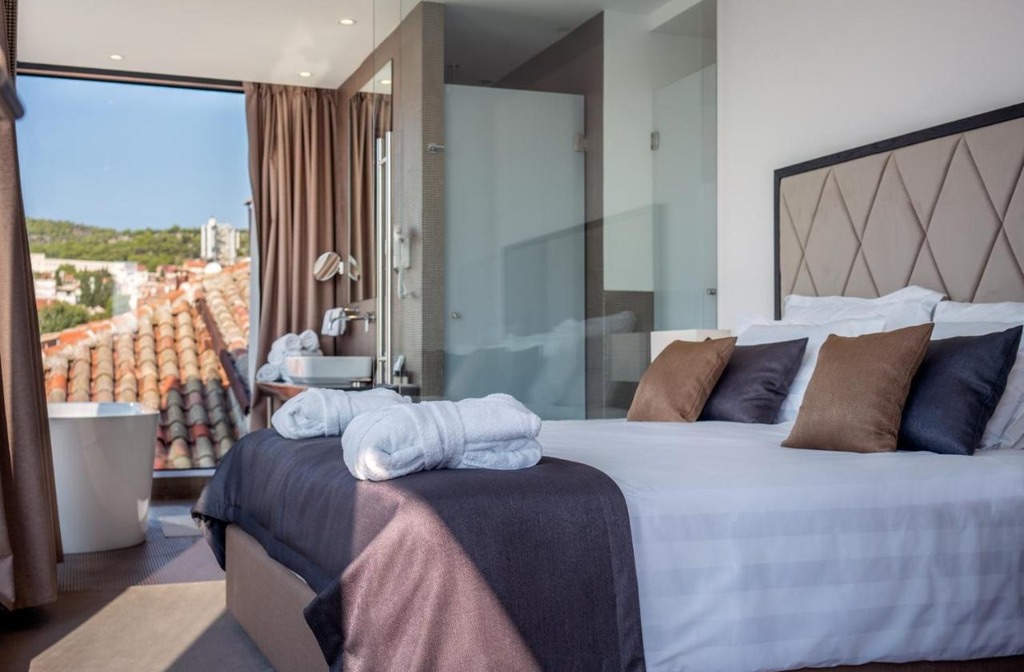Schickes Boutiquehotel mit aussergewöhnlicher goldfarbiger Fassade, am Altstadtrand von der historischen Stadt Šibenik gelegen mit Aussicht auf die Meerespromenade.