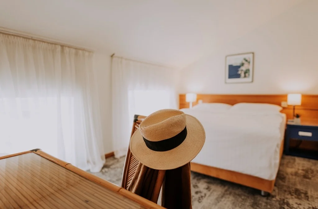 Charmant eingerichtete 24 Zimmer, 8 Doppelzimmer im Dachstock, 6 Doppelzimmer Standard, 8 Doppelzimmer Superior Meerblick, 2 Doppelzimmer Superior Meerblick Balkon, 1 Junior Suite Meerblick Balkon.