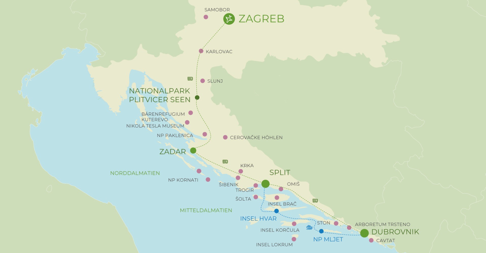 Zagreb - Nationalpark Plitvicer Seen - Zadar - Makarska - Dubrovnik - Nationalpark Mljet - Insel Hvar - Split