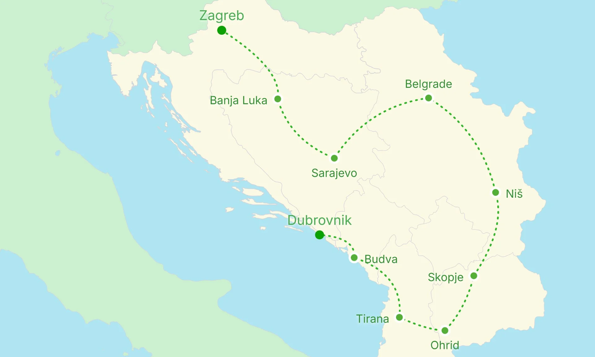 Zagreb - Banja Luka - Sarajevo - Belgrad - Nis - Skopje - Ohrid - Tirana - Budva - Dubrovnik